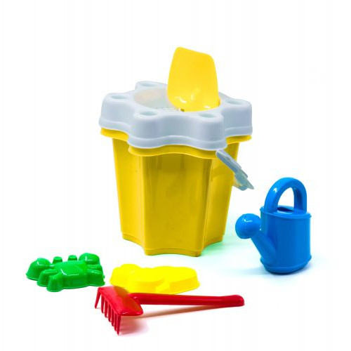 Большое ведерко (22 х 22 х 20 см) в форме цветка с набором для игры в песке: лопатка, грабли, лейка, 2 пасочки, сито. Подходит для игры дома, на улице, в саду и на пляже.