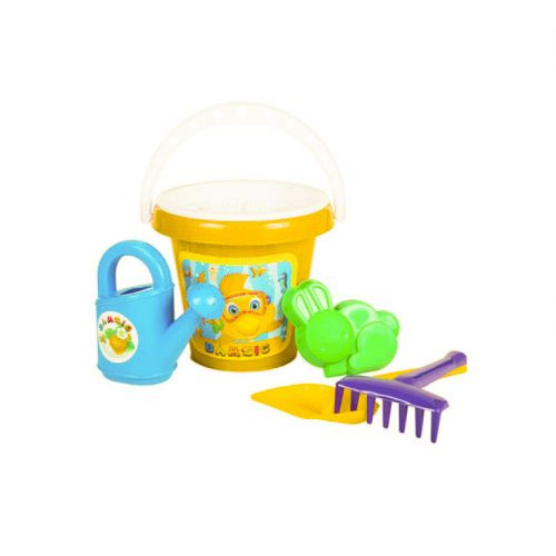 В набор входит 6 элементов: ведро (20 х 18,5 х 17 см), лопатка (25 см), грабли (19,5 см), лека, сито и пасочка. Подходит для игры дома, на улице, в саду или на пляже.