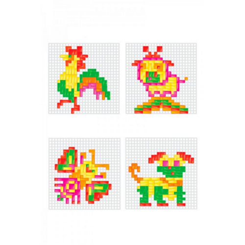 Как собрать мозаику? Рисунок выкладывается на пластиковое поле мелкими фишками различных форм. Всего в комплекте 220 элементов 5-ти цветов! Размер самого маленького квадратика 4х4 мм. На помощь детям также есть специальный инструмент, которым удобно вынимать фишки с поля. Для юных творцов в наборе есть инструкция, согласно которой можно собрать 4 рисунки: петушка, бабочки, собачки и бычка.