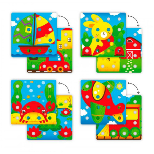 Развивающий набор - ДЛЯ ЗАНЯТИЙ МОЗАИКОЙ создан для погружения ребенка в мир форм, цветов и фантазий. Вы также сможете создать рисунок по образцу или построить башни из основ и фишек!