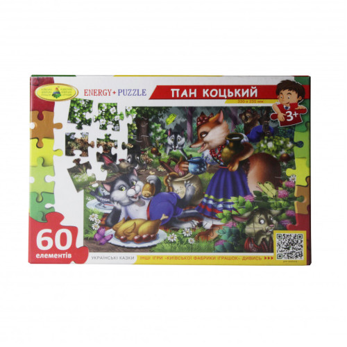 На игровом поле размером 330 х 235 мм изображен сюжет из сказки Пан Котский.