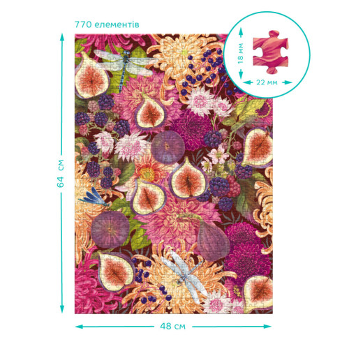 Наслаждайтесь гармонией природы с уникальным пазлом Dodo Botany. Иллюстрация наполнена сочными плодами инжира, цветами и яркими деталями, создающими впечатление настоящей ботанической коллекции.