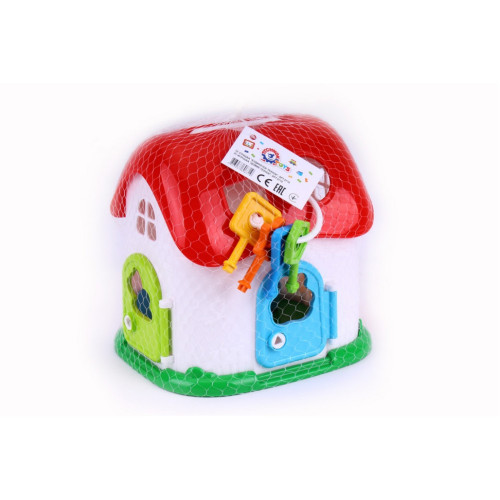 Игрушка "Домик" - это большая избушка с 4-а дверями под красной крышей. Через фигурные проемы в дверях внутрь можно протолкнуть фигурки зверей: лягушки, лошадки, мишки и бабочки. А чтобы достать зверюшек, необходимо открыть дверцу соответствующим ключом. Для помощи малышам цветные подсказки – фигурки зверушек, дверей и ключиков совпадают по цвету. Форма ключика также не случайна и соответствует замочку на конкретной двери: квадрат, треугольник, ромб и звезда. Через отверстия в крыше можно протолкнуть формочки геометрических фигур. Эти формочки специально спроектированы для правильного обучения – они высокие, и их нельзя протолкнуть боком, или в неверное отверстие.