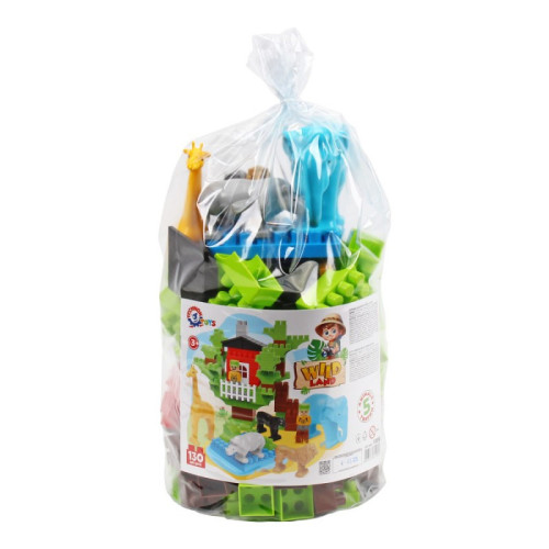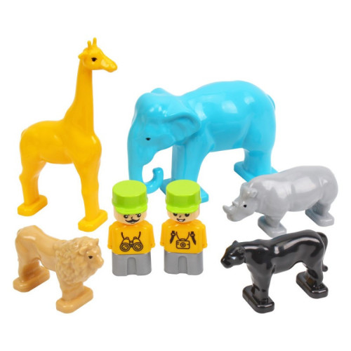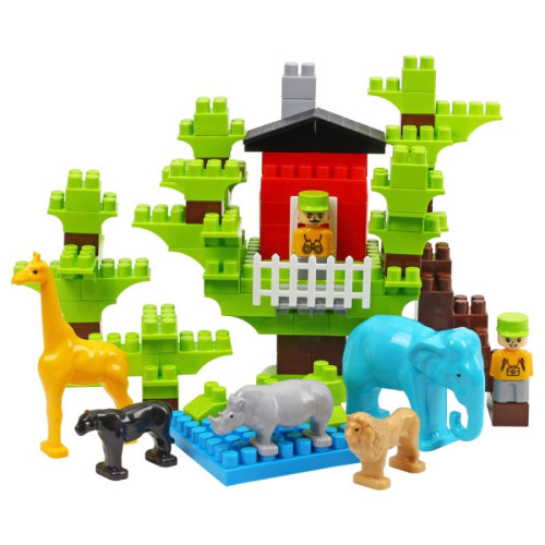 Набор содержит 130 деталей, из которых ребенок может собрать домик на дереве, загоны для животных и элементы окружающей среды. В комплекте есть фигурки диких животных - жираф, слон, лев, пантера и носорог, а также две фигурки смотрителей зоопарка, которые помогают создавать различные игровые сценарии.