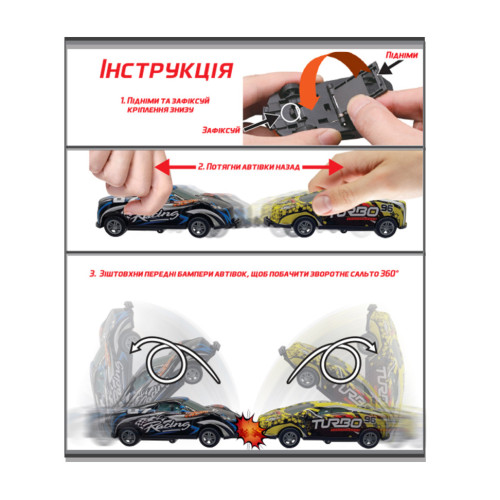 Ведь машинки «КРУТОЙ ПЕРЕВОРОТ» не только умелые и быстрые гонщики, они еще умеют делать сальто на 360 градусов! Закрепи - Потяни - Столкни!