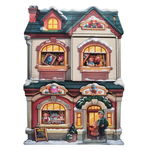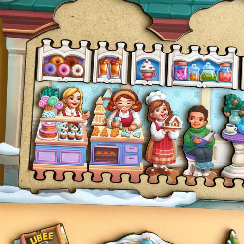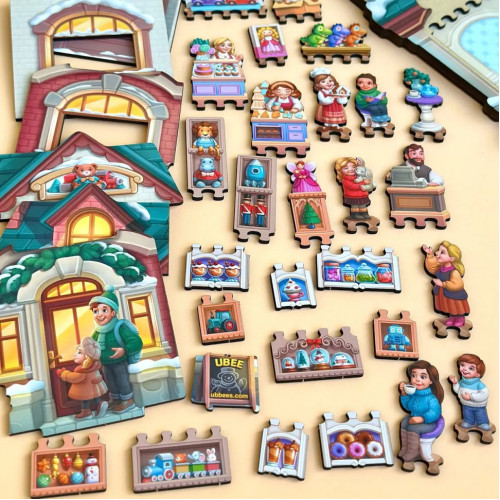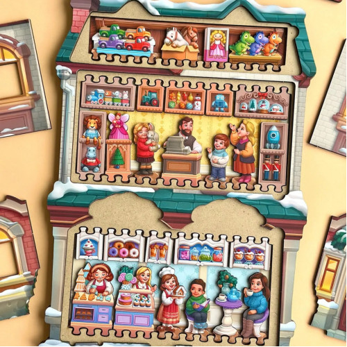 Это двухслойный пазл в виде домика, в котором скрывается целый мир игрушек и сладостей! Открывай окошки и двери и узнавай, что там внутри! Дети сочиняют, ищут детали, придумывают собственные сюжеты и учатся замечать мелочи.