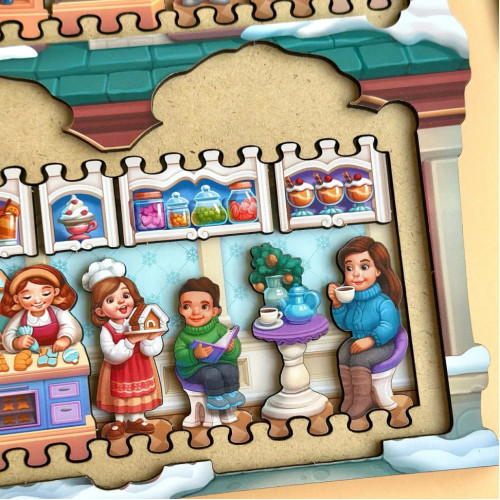 Верхний слой пазла – фасад домика с крышей, окнами, дверями и вывесками.