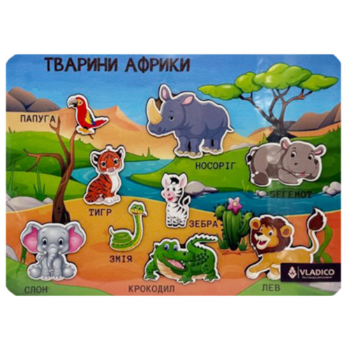 Откройте для своего ребенка увлекательный мир дикой природы с деревянным пазлом-вкладышем "ЖИВОТНЫЕ АФРИКИ"!