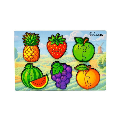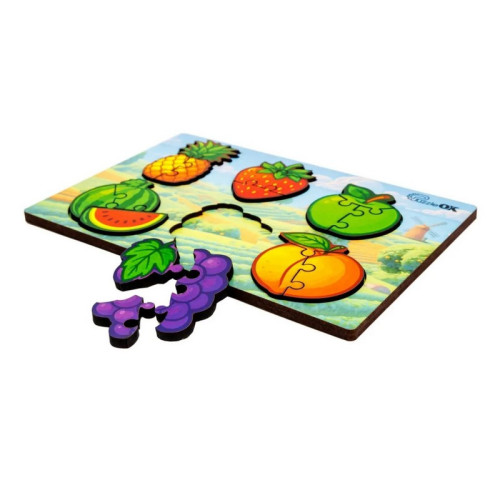 Деревянный пазл-вкладыш формата А5 содержит 18 ярких деревянных деталей, которые помогают ребёнку развивать мелкую моторику, координацию рук и глаз, логическое мышление и внимание. Раскладывая и подбирая детали по форме и цвету, ребёнок тренирует память, наблюдательность и аналитические способности.