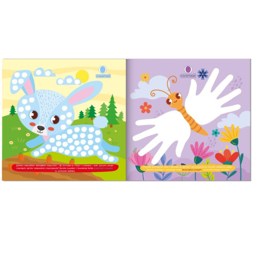 На каждом рисунке есть специальные места, которые нужно раскрасить пальчиками, или ладошками, или же и тем, и тем. А дальше все просто - малыш макает пальчики или ладошки в пальчиковые краски, касается страниц и ставит отпечатки в обозначенных местах и раскрашивает рисунок. А ладошками можно рисунок не просто раскрашивать, но и дорисовывать и завершать.