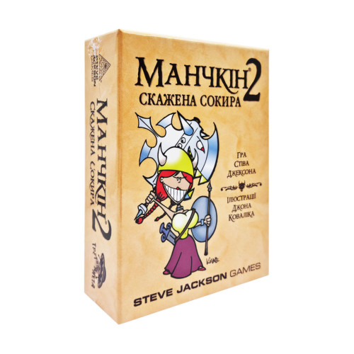 Теперь у манчкинов новые широкие подземелья с длинными коридорами и просторными пещерами. Манчкин 2: Бешеный Топор (Munchkin 2: Unnatural axe) вышел на украинском языке и особенно забавляет необычным переводом названий монстров и шмоток, сохраняя при этом чувство юмора. Оно не перемещает действия игры в космос, как это сделал Звездный Манчкин и не отправляет игроков под воду, как это сделал Манчкин Ктулху. Дополнение сохранило все локации и оставило участников в зоне комфорта, единственное – расширив поле боя. Такое дополнение отлично подходит игрокам, любящим оригинального Манчкина, за его простоту, яркость и чувство юмора. Хотя вся серия игр Манчкина радует нас интересными решениями.
