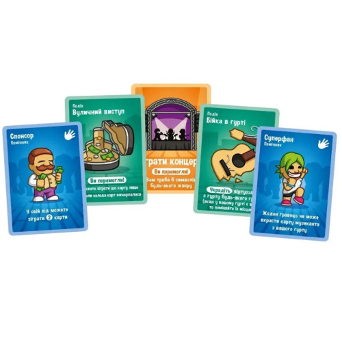 - Карты "События", которые позволяют красть музыкантов у соперников, устраивать драки в группе, мешать другим участникам одержать победу и не только.