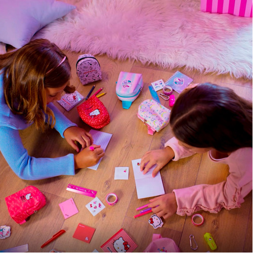 Внутри сумочки есть 5 предметов с брендированием HELLO KITTY. В Русалочке Вы найдете: линейку, блокнот, маркер, цветную клейкую ленту, наклейки.