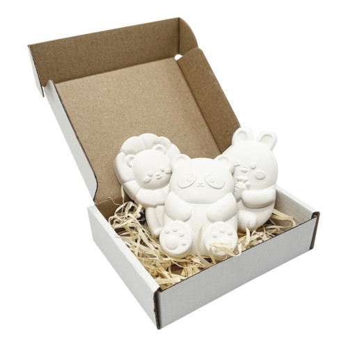 В наборе вы найдете панду, зайчика с морковкой и львенка - каждая фигурка (приблизительно 8 см) имеет свой уникальный характер, поэтому их интересно раскрашивать.