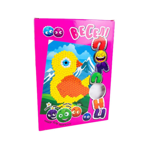 Совместить веселое развлечение и развитие ребенка поможет аппликация «Веселые помпоны Курчатко» (Strateg Арт. 30992).