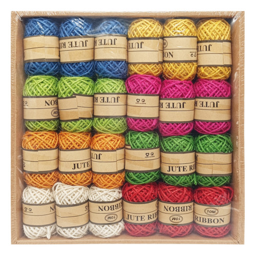 Нитки для творчества джутовые разноцветные используются для рукоделия, упаковки сувениров, декора предметов интерьера. Моток без втулки 10м, диаметр нити 2 мм.