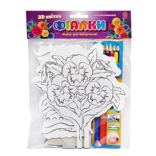 Раскраска-конструктор 3Д в форме букета фиалок обязательно заинтересует ребенка. В комплекте идут карандаши и картонные заготовки. Раскрашивая и собирая раскраску малыш получит удовольствие от творческого процесса и хороший сувенир, сделанный своими руками. Размер готового изделия (140x185 мм) 130х210х20