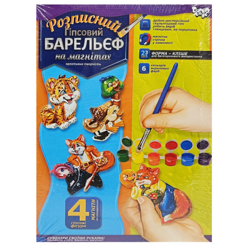 Изготовление изделий из гипса - это увлекательное занятие для ребенка, ведь он чувствует себя настоящим творцом. Раскрасив полученные гипсовые изделия акриловыми красками из набора, ребенок становится еще и художником. Но это еще не все! Прикрепляем магниты из набора и яркие барельефы становятся настоящим подарком для друзей и близких! Красивые объемные гипсовые фигурки-магнитики станут прекрасным украшением любого уголка вашего дома, а ребенку подарят ни с чем не сравнимую радость творчества! В набор входит: Скульптурный гипс для изготовления гипсового раствора Формы для отливки фигурок (4 шт.) Магнитная лента Набор акриловых красок для окрашивания отлитого изделия (6 шт.) Кисточка Подробная инструкция-рекомендация с описанием и порядком проводимых работ. Мелкодисперсный скульптурный гипс делает готовые гипсовые барельефы глянцевыми, как фарфор. Ваш маленький скульптор будет в восторге как от процесса создания фигурок, так и от конечного результата творческой работы малыша - фигурок на магнитах!