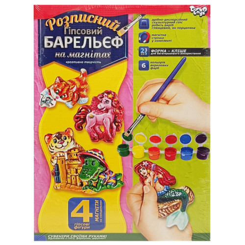 Изготовление изделий из гипса - это увлекательное занятие для ребенка, ведь он чувствует себя настоящим творцом. Раскрасив полученные гипсовые изделия акриловыми красками из набора, ребенок становится еще и художником. Но это еще не все! Прикрепляем магниты из набора и яркие барельефы становятся настоящим подарком для друзей и близких! Красивые объемные гипсовые фигурки-магнитики станут прекрасным украшением любого уголка вашего дома, а ребенку подарят ни с чем не сравнимую радость творчества! В набор входит: Скульптурный гипс для изготовления гипсового раствора Формы для отливки фигурок (4 шт.) Магнитная лента Набор акриловых красок для окрашивания отлитого изделия (6 шт.) Кисточка Подробная инструкция-рекомендация с описанием и порядком проводимых работ. Мелкодисперсный скульптурный гипс делает готовые гипсовые барельефы глянцевыми, как фарфор. Ваш маленький скульптор будет в восторге как от процесса создания фигурок, так и от конечного результата творческой работы малыша - фигурок на магнитах!