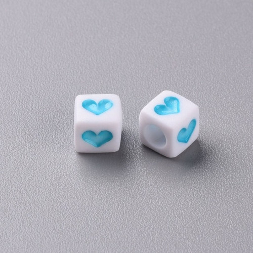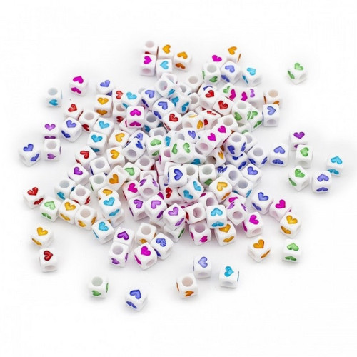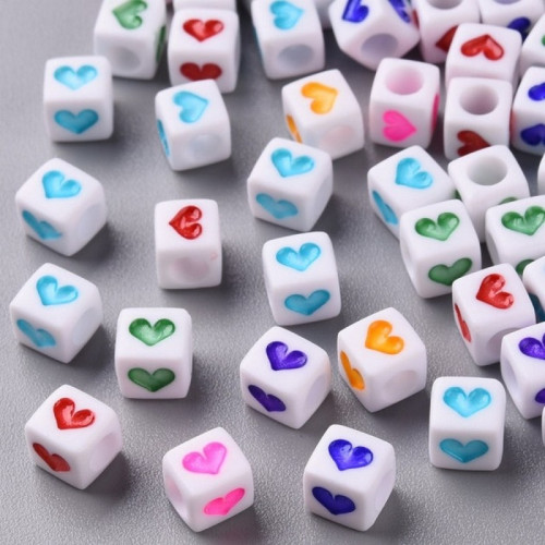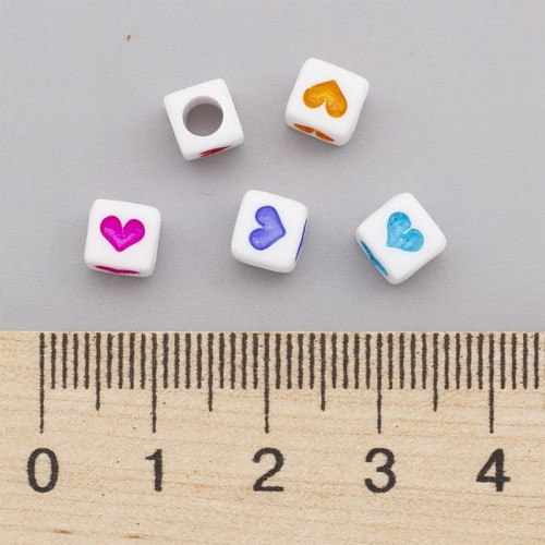 Акриловые непрозрачные бусины, кубики. На кубиках разноцветные сердца. Размер: Длина 6,5 мм, Ширина 6 мм, Толщина 6 мм, Отверстие 3 мм, Около 150 шт./25 г.