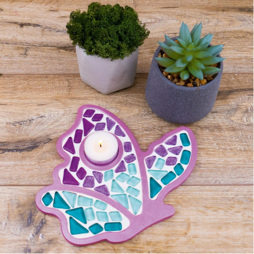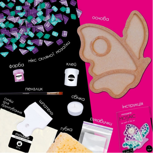 Комплектация: основа, микс стеклянной мозаики, свеча, смесь для грунтовки, перчатки, губка, краска, кисточка, клей, шпатель, инструкция.