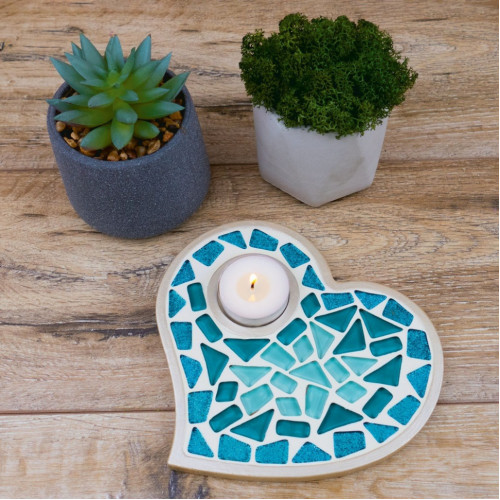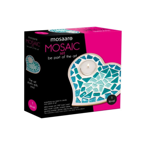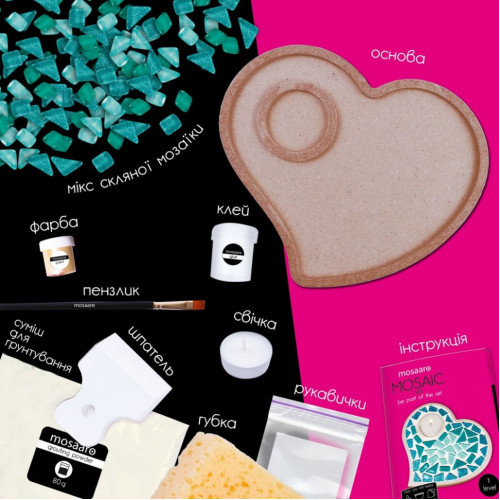 Комплектация: основа, микс стеклянной мозаики, свеча, смесь для грунтовки, перчатки, губка, краска, кисточка, клей, шпатель, инструкция.