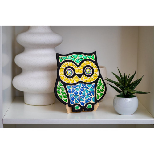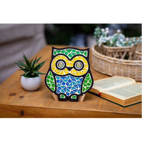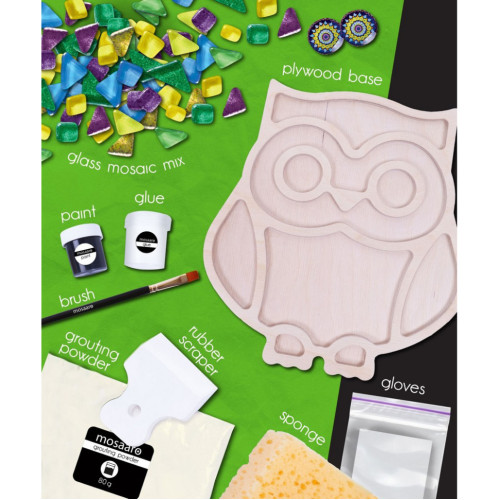 Набор содержит: основу из МДФ, набор стеклянной мозаики, 2 цветных кабашона, клей на водной основе, акриловую краску, кисточку, шпатель, смесь для затирания швов, деревянную палочку для замешивания, перчатки, губку, подставку из фанеры, мерную ложку, мешочек, предупреждение, инструкцию.