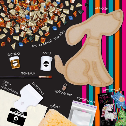 Комплектация: основа из МДФ, стеклянная мозаика, акриловая краска, смесь для затирки швов, кисточка, перчатки, набор креплений, клей на водной основе, резиновый шпатель, губка, деревянная палочка, мерная ложка, упаковочная бумага, мешочек из спанбонда.
