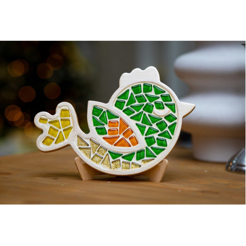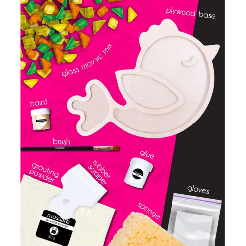 Набор содержит: основу из МДФ, набор стеклянной мозаики, клей на водной основе, акриловую краску, кисточку, шпатель, смесь для затирания швов, деревянную палочку для замешивания, перчатки, губку, крепление на стену, мерную ложку, мешочек, предупреждение, инструкцию.