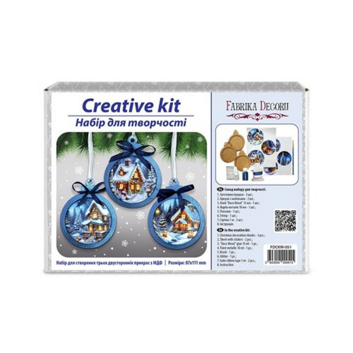 Набор включает все необходимое для создания елочных украшений: заготовки из плотного ХДФ толщиной 3мм, сказочные зимние изображения, ленты, блестки, краска, клей и кисточка. Изделия просты в работе и подходят для начинающих и для опытных мастеров. Наши творческие наборы - это чудесный способ не только сэкономить деньги, но и весело провести время с детьми, при этом, готовые украшения станут прекрасным оформлением для любой елки.