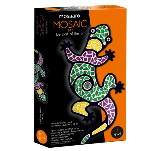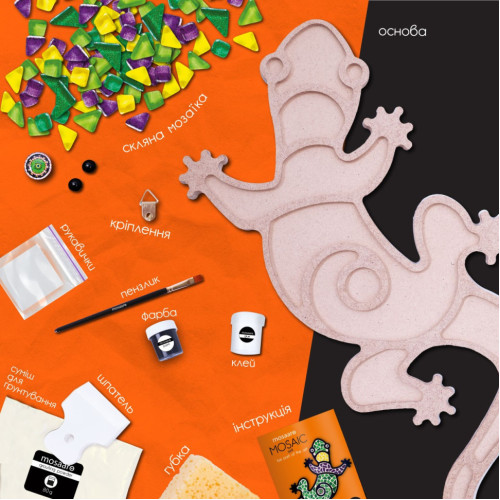 Набор содержит: основу из МДФ, стеклянную мозаику, клей на водной основе, акриловую краску, кисточку, шпатель, смесь для затирки швов, деревянную палочку для замешивания, перчатки, губку, подставку из фанеры, мерную ложку, мешочек, инструкцию и предупреждение.