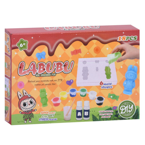 В наборе 6 молдов и 18 предметов, которые позволяют создать собственного Лабубу и оформить его по вкусу ребёнка. Игрушка получается мягкой, её можно сжимать и мять, что делает Лабубу личным антистрессом.