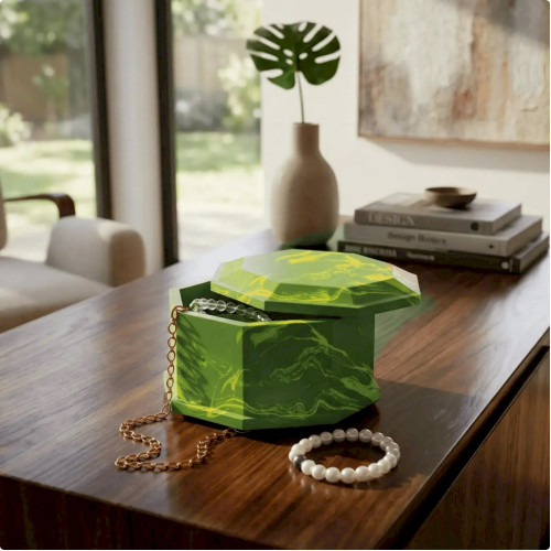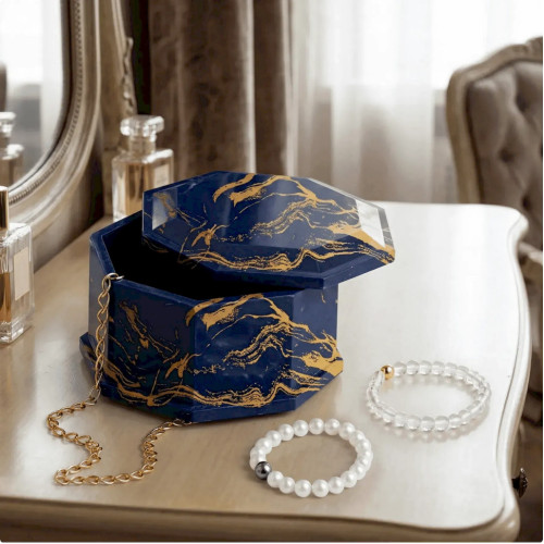 Подготовьте рабочее место, застелив поверхность пленкой, и наденьте перчатки. В мерном стакане смешайте гипс с водой в пропорции примерно 100 г гипса на 40 мл воды. Тщательно перемешайте смесь до однородной консистенции без комочков. Добавьте выбранный перламутровый краситель или сочетайте несколько оттенков для создания интересного декоративного эффекта. Медленно залейте смесь в силиконовую форму и слегка постучите по ней, чтобы убрать пузырьки воздуха. Оставьте изделие застывать на 40-60 минут, после чего осторожно извлеките его из формы и дайте полностью высохнуть в течение 12-24 часов. После высыхания покройте поверхность акриловым лаком для блеска и дополнительной защиты. Готовую шкатулку можно использовать для хранения украшений или как декоративный элемент интерьера.