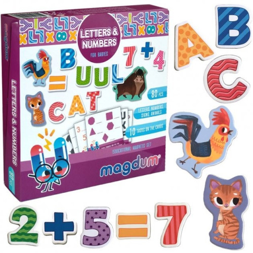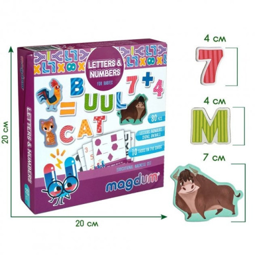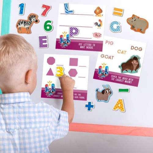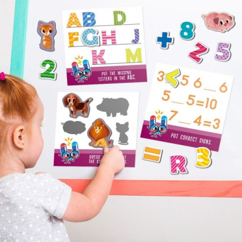 В набор входят магниты в виде букв английского алфавита, математических знаков, цифр и животных, а также карточки с играми-заданиями. Ребёнок будет искать правильные буквы и цифры, считать углы геометрических фигур, расставлять нужные знаки, складывать, вычитать, составлять слова, попутно развивая внимание, логику, мышление, память.
