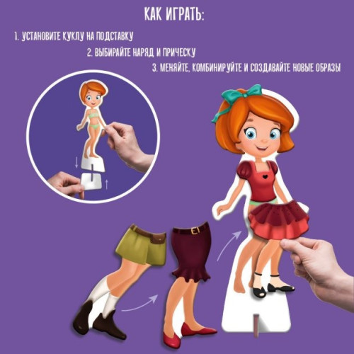 Куклу можно держать в руках и наряжать или закрепить на подставке, чтоб она стояла, и тогда подбирать новый лук. Благодаря магнитной основе, одежки легко фиксируются на кукле.