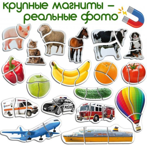 Чтобы собрать картинку, нужно соединить 3 детали. Магниты удобно брать рукой, ведь они толстые (3мм), прочные и крепкие. Играть можно на холодильнике или магнитной доске, если малыш маленький и ему трудно, играйте на полу или столе.