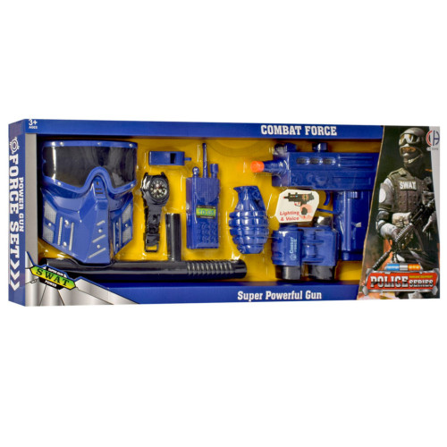 В наборе есть маска, автомат, рация, граната, бинокль, дубинка, часы и свисток, что позволяет создать полный образ полицейского и придумывать различные сценарии игры. Некоторые элементы имеют звуковые и световые эффекты, что добавляет реалистичности и делает игру ещё интереснее.