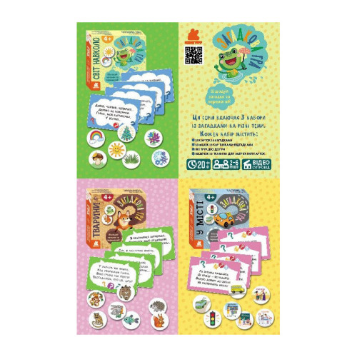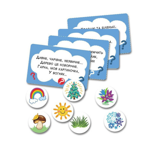 Каждый набор содержит карты и фишки. На каждой карте есть стихотворная загадка, которую детям предлагается разгадать. И это еще не всё! Ребёнок должен не только дать правильный ответ, но и отыскать фишку с соответствующим изображением.