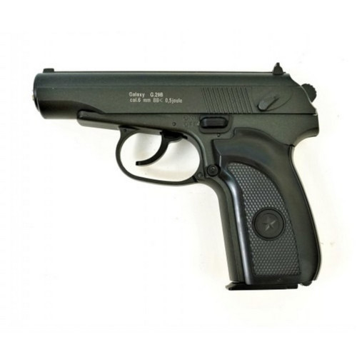 Страйкбольный пистолет Galaxy G.29B (ПМ), черная рукоять - это пружинная отечественного Макарова, выполненная азиатским производителем пневматики для стрельбы на короткие дистанции. Изделие относиться к модификациям с хорошей работоспособностью в любых условиях, при этом не нуждается в расходниках (кроме боеприпасов) и обладает высокой степенью безопасности. Распрямляясь, она сообщает шарикам ВВ энергию, необходимую для полета. Начальная скорость выстрела около 50 м/с. Магазин пистолета на 12 боеприпасов. Размер дульной энергии - чуть более 0,5 Дж, Пистолет имеет цельнометаллический корпус, используемые в производстве материалы - металл с цинком и пластик. Стрельба возможна только в одиночном режиме огня. Используются открытые прицельные устройства. Внешне и по габаритам пистолет схож с огнестрельным аналогом, на рифленой рукоятке черного цвета хорошо узнаваемая пятиконечная звезда.