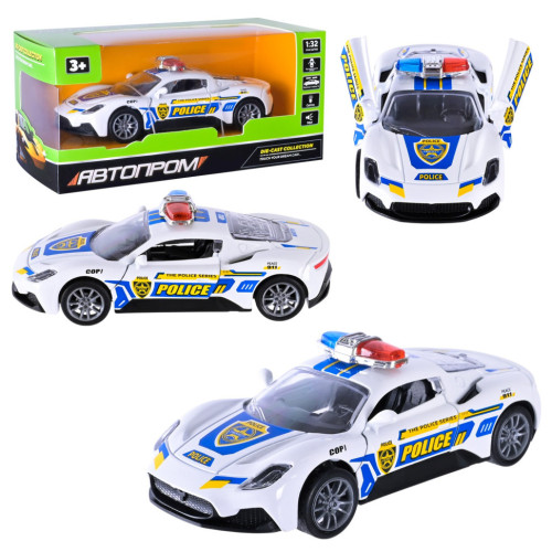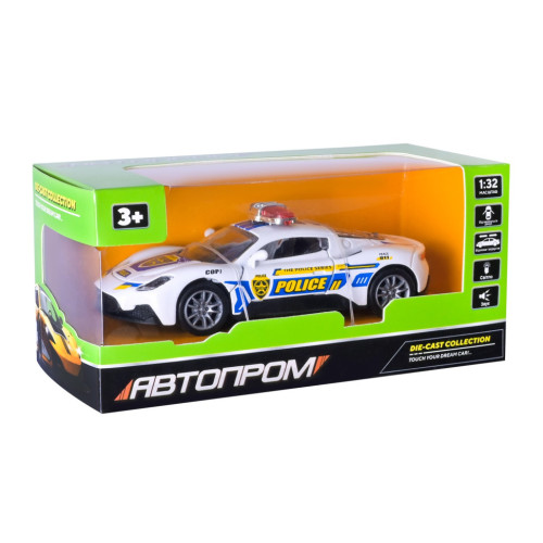 Игрушечная металлическая полицейская машинка в виде спорткара от «АВТОПРОМ», изготовленная в масштабе 1:32, станет отличным подарком для детей, интересующихся машинками, и любителей собирать коллекции миниатюрных моделей.