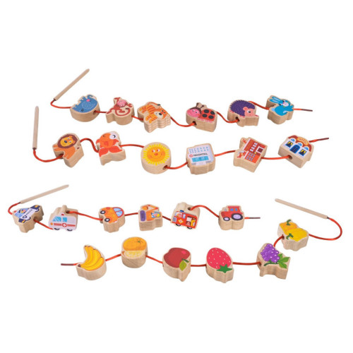 Набор состоит из деревянной основы (часто в виде большого фрукта, животного, обуви или другого интересного объекта с отверстиями) и специального шнурка с удобным деревянным или пластиковым кончиком. Задача ребенка — продеть шнурок через все отверстия в определенной последовательности, «вшивая» его в основу.