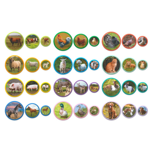 В комплект входят 36 ярких магнитных элементов, состоящих из 12 семейств животных, обитающих на ферме. Здесь вы найдете семьи овечек, лошадей, курочек, уток, свинок и других животных. Каждая семья состоит из взрослых животных и их малышей, что помогает ребенку лучше понять понятие родственных связей и жизни на ферме.