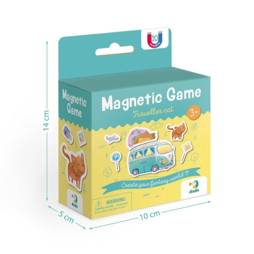 В наборе содержатся 20 магнитных элементов, включая милого котика-путешественника, автобус и различные атрибуты путешествия. Эти магниты легко прикрепляются к магнитной доске или холодильнику, позволяя малышу создавать свои собственные истории и приключения, где каждое путешествие ведет к новым открытиям.