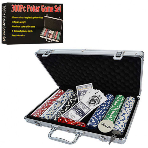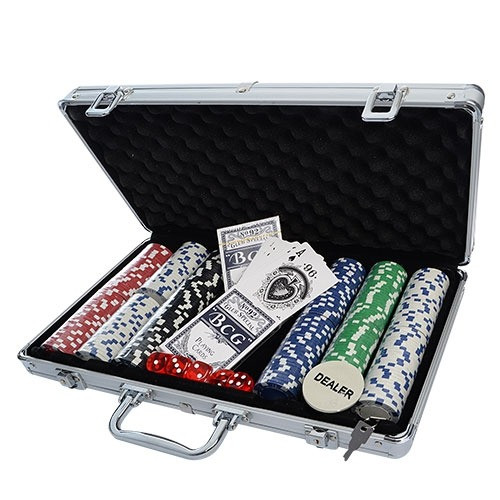 С таким набором вы сможете интересно провести время в кругу друзей или семьи. В комплект входит 300 фишек без наминала, 2 колоды карт, фишка дилера, 5 игральных кубиков. Все это сложено в удобный, алюминиевый кейс.