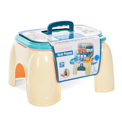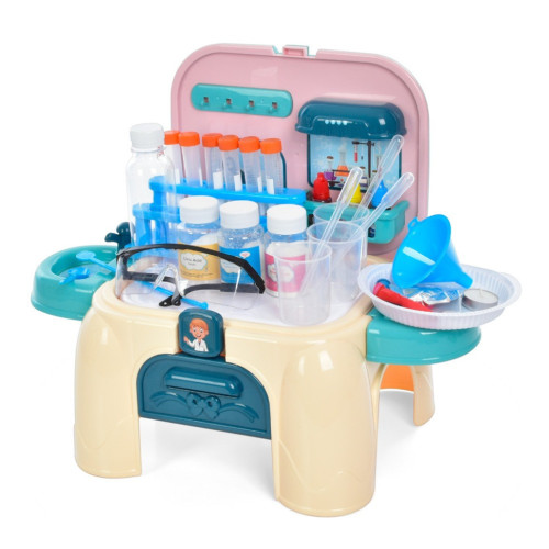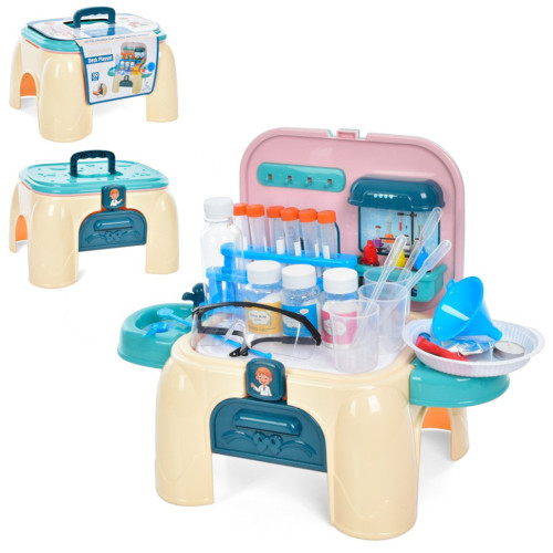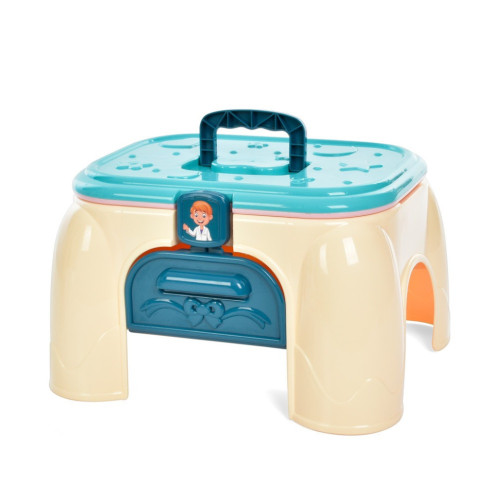 Он содержит такие важные медицинские игрушечные инструменты, как: стаканы, баночки, пробирки, стул и множество других докторских аксессуаров.