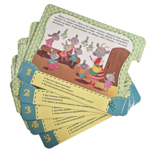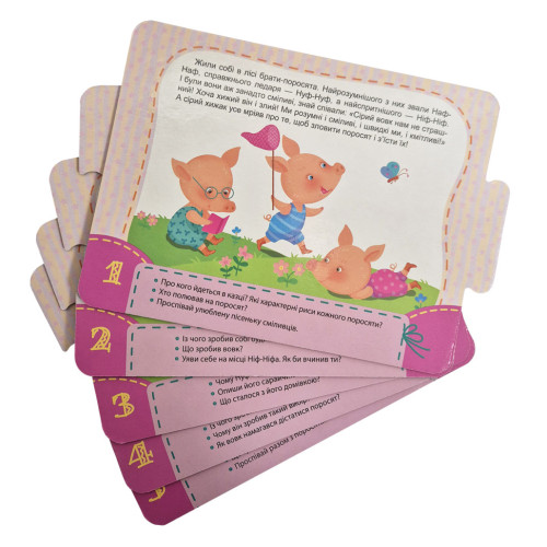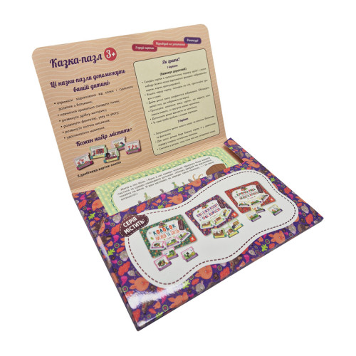 Иллюстрации любимых детских сказок расположены на 5 карточках-пазлах. В наборе идет две сказки (с лицевой стороны и с обратной стороны). Кроме сюжетных изображений и текста сказки, на каждой карте находятся несколько вопросов относительно того, что изображено. Они ориентированы на развитие логического мышления, фантазии и внимательности. Пазлы смоделированы таким образом, что ребенок сможет составить свой сюжет сказки, разместив карточки по собственному желанию и фантазии.