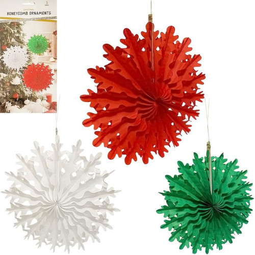 Набор подвесных украшений Honeycomb «Снежинка» содержит 3 бумажных элемента диаметром 30, 40 и 50 см. Украшения выполнены в праздничных цветах — белом, красном и зеленом, в технике «соты», что создает объемный и нежный эффект. В комплекте 6 скрепок. Упаковка: 30 * 14см. Такие снежинки прекрасно подходят для декора дома, офиса, витрин или праздничных залов, добавляя атмосферу уюта и радости.