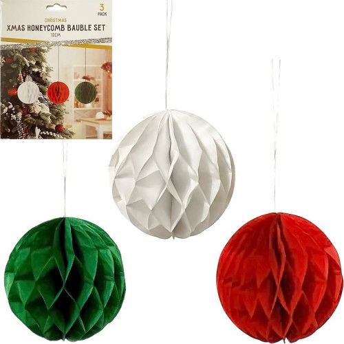 Набор подвесных украшений Honeycomb «Шарики» содержит 3 декоративных элемента диаметром 10 см. В комплект входят шарики белого, красного и зеленого цветов, изготовленные из плотной бумаги в технике «соты». В набор также входят скрепки по 2 шт каждого цвета для удобного крепления. Украшения легко складываются и раскладываются, создавая объемный эффект. Идеально подходят для праздничного оформления дома, офиса, витрин или мероприятий, добавляя интерьеру яркости и уюта.