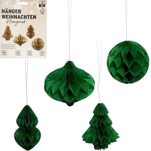 Набор подвесных украшений Honeycomb «Зеленые фигуры» содержит 4 бумажных элемента разных форм: круглая (Ø8×8 см), каплевидная (Ø8×6 см), ромбовидная (Ø6×8 см) и елочка (Ø6×8 см). Украшения выполнены в насыщенном зеленом цвете из плотной бумаги в технике «соты», что придает объем и легкость. Идеально подходят для декора новогоднего интерьера, витрин, офисов или праздничных мероприятий.