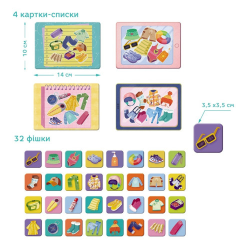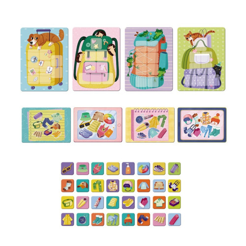 В этой игре для маленьких исследователей каждый игрок выбирает свой "чемодан" и получает список вещей, которые нужно взять в путешествие. Все фишки переворачиваются изображением вниз. Игроки по очереди открывают фишки и произносят название предмета. Если предмет есть в их списке — фишка откладывается в чемодан. Если нет — возвращается на место.